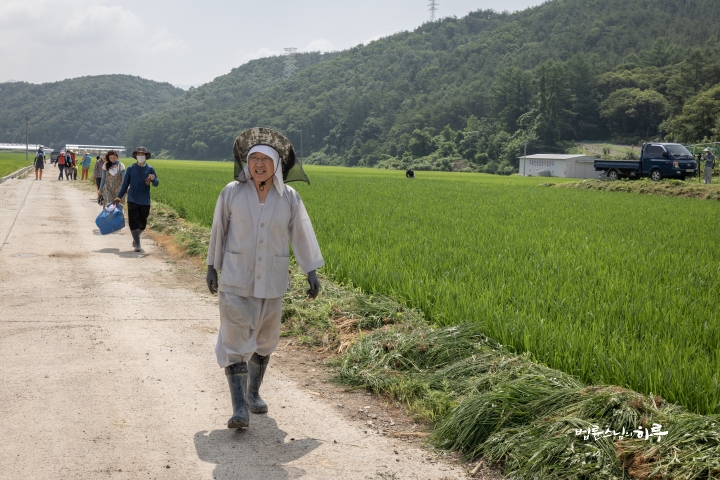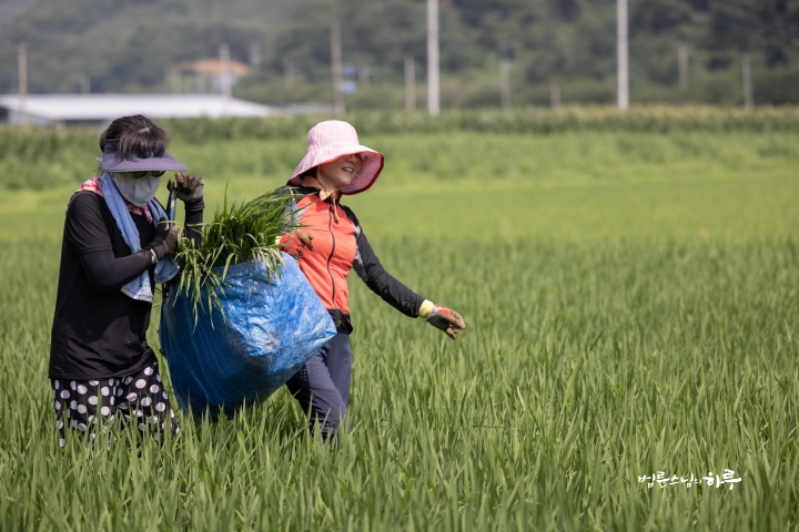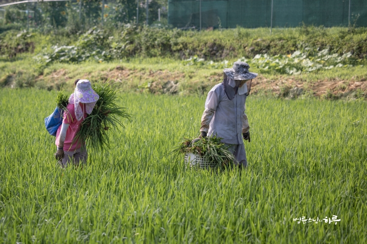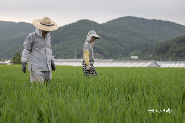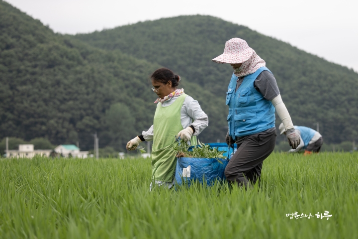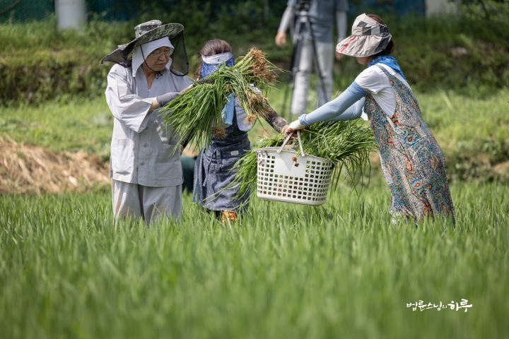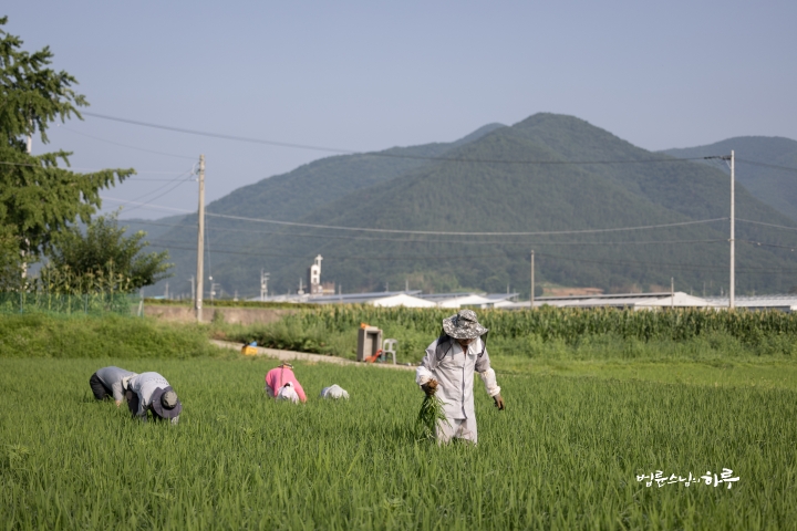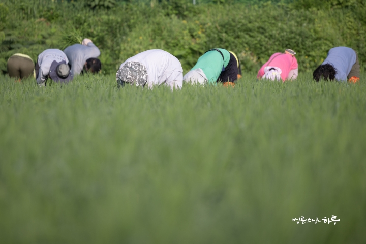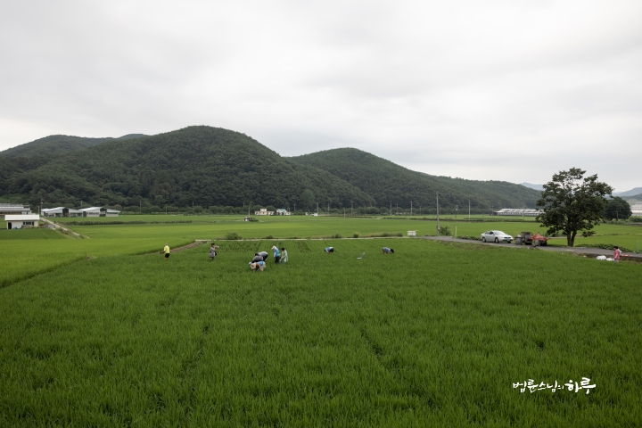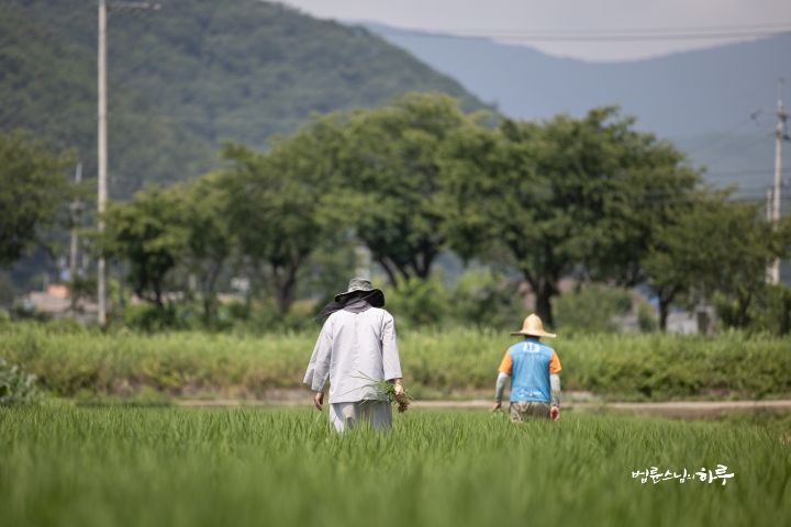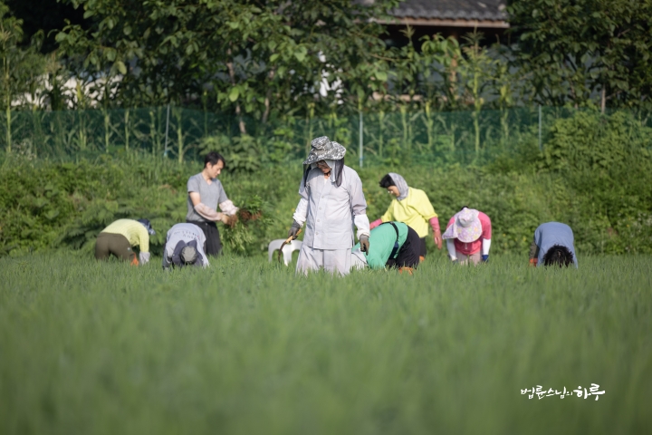 Weeding in the rice fields is to continue tomorrow. Tomorrow, Sunim will weed with others in the early morning, conduct a Dharma Q&A session at a forum called Happiness Square for the Korean Minutemen for Peace and Unification, and conclude the week by hosting the live-streamed Sunday Meditation with Ven. Pomnyun Sunim in the evening.