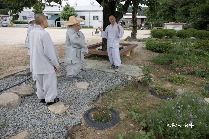 At 8:30, 16 volunteers from Busan and Ulsan Division and Daegu and Gyeongbuk Division arrived. Haengjas hurried to the retreat center to have balugongyang (Korean monastic temple meal) while Sunim continued to weed with the volunteers.