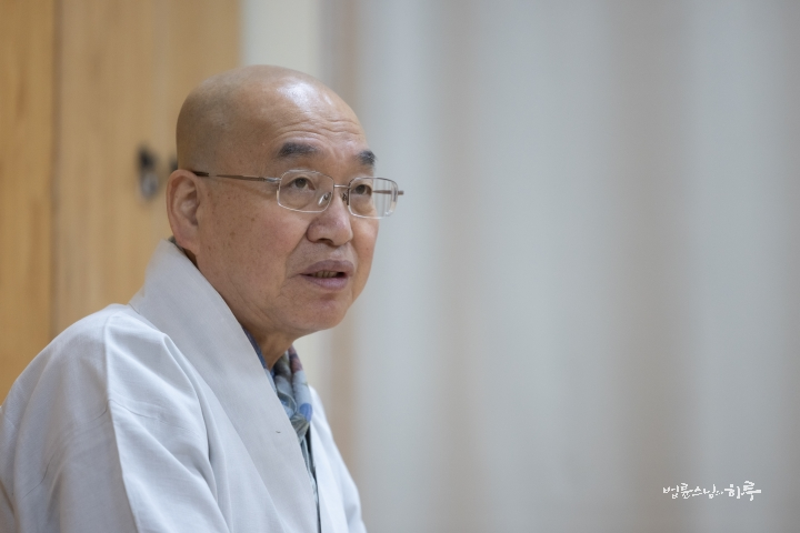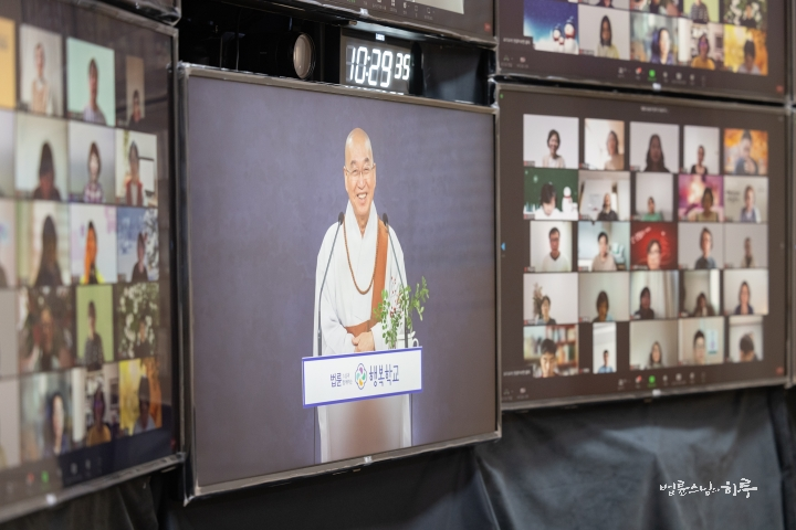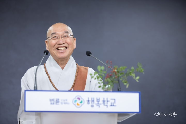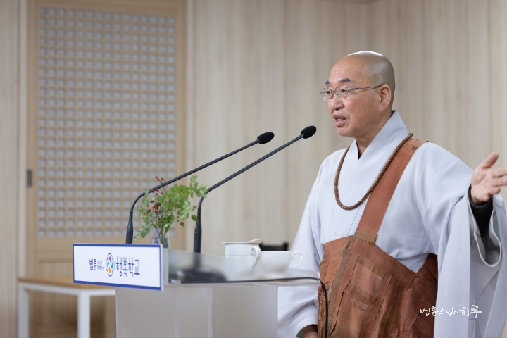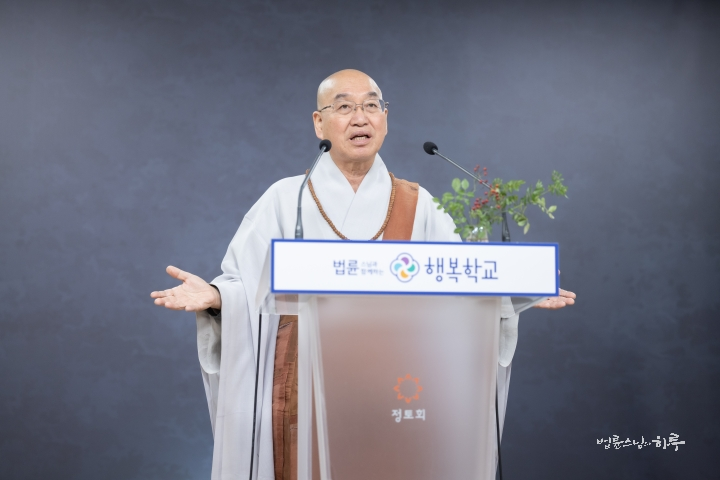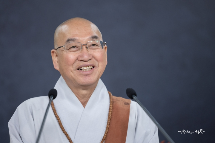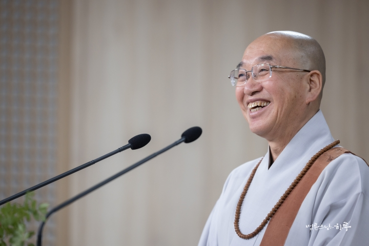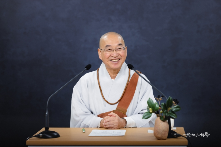 At 4:30 am, Ven. Pomnyun Sunim began his day with the live 1,000-Day Practice. After the ringing of the bell, the Yebul ceremony, Words for Practice, Repentance, 108 bows, and sutra reading, Sunim gave a Dharma talk.