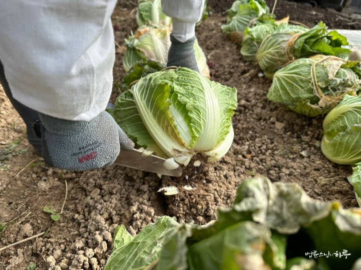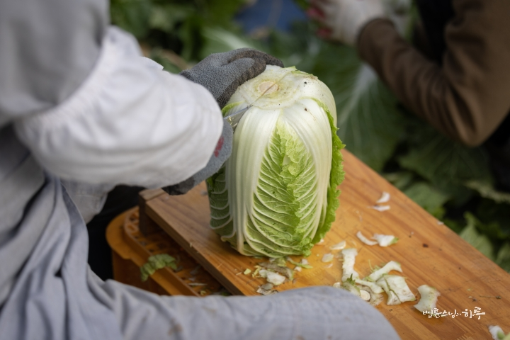 After harvesting the cabbages, Sunim trimmed them. A trainee removed the damaged outer leaves before handing it over to Sunim, then Sunim cut the trimmed cabbage in half and cut its stem slightly. When the cabbage was cut in half, we could see that the leaves were packed tightly.