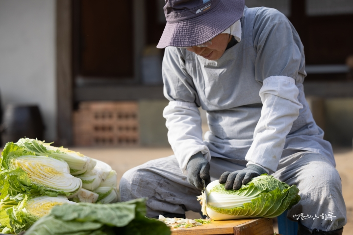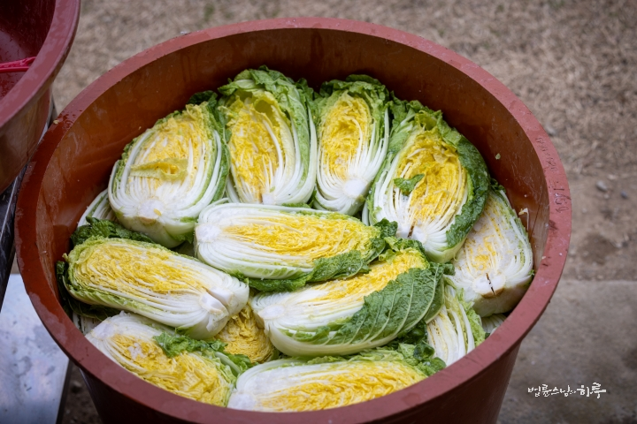 The undamaged outer leaves were set aside to be used for wrapping kimchi.