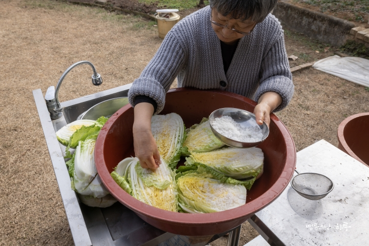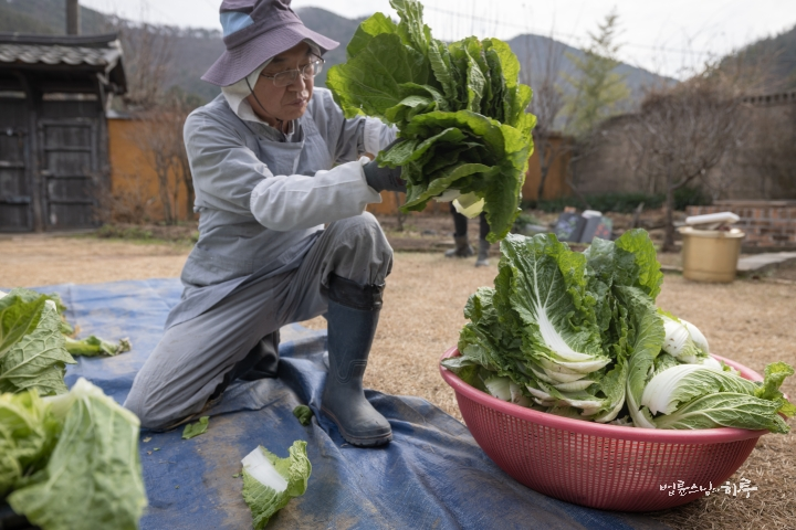 Right after lunch, Sunim began to work outside. Today, he harvested the cabbages that remained in the vegetable gardens and salted them. The kimchi he had made with the members of the sangha was too spicy, so it was decided to make less spicy kimchi. Cabbages were harvested first.