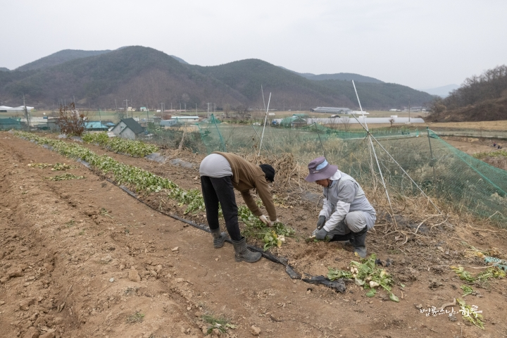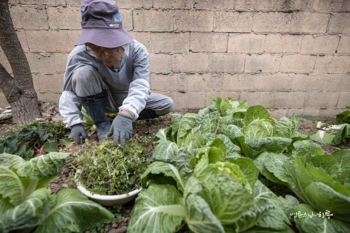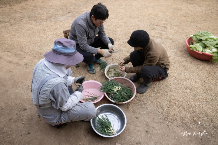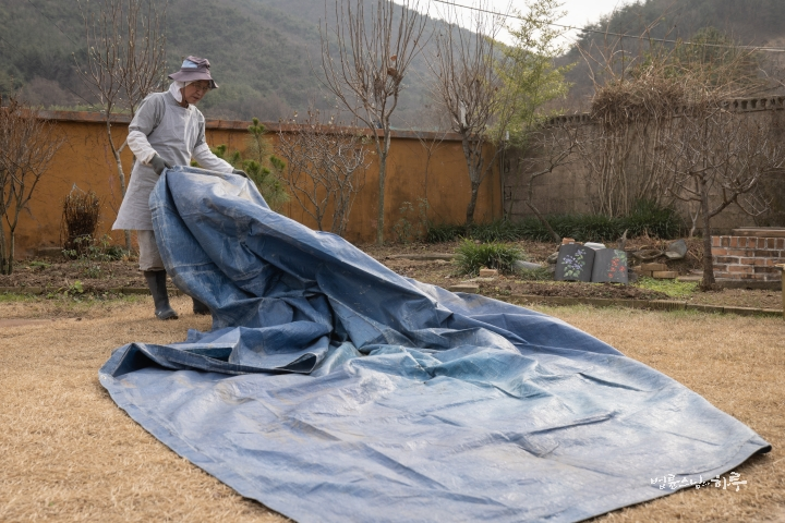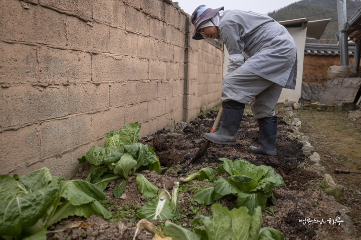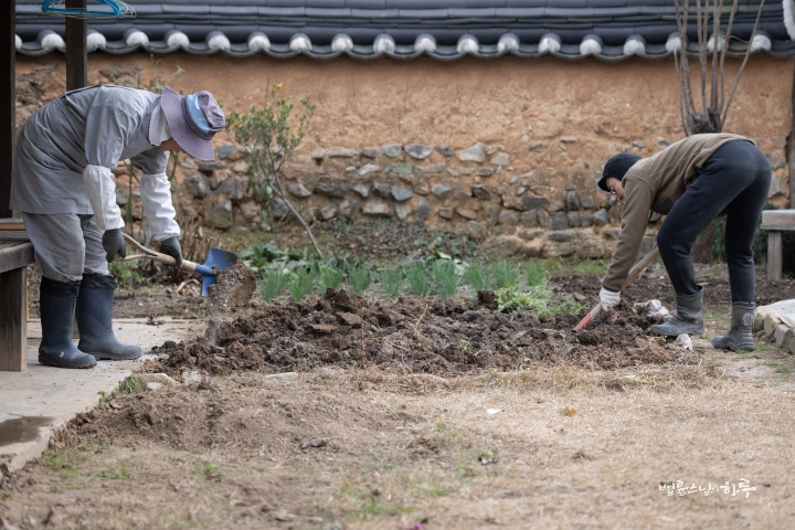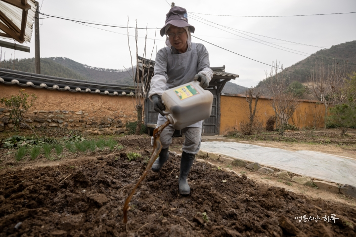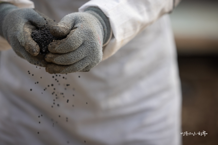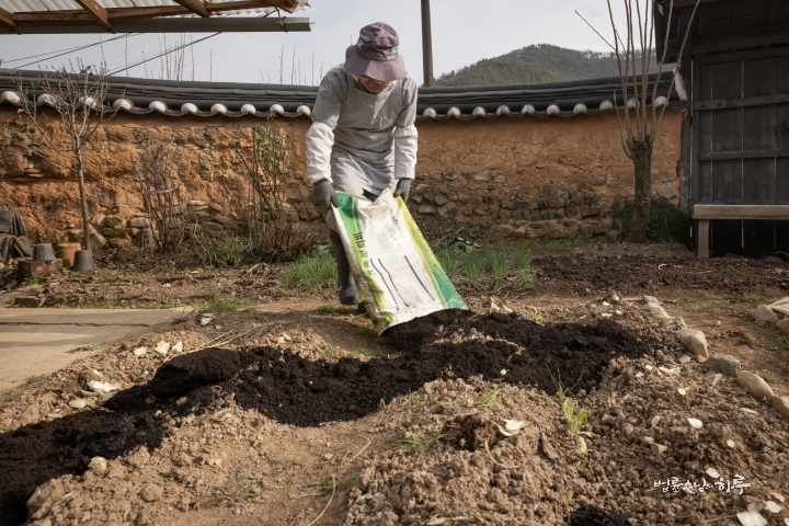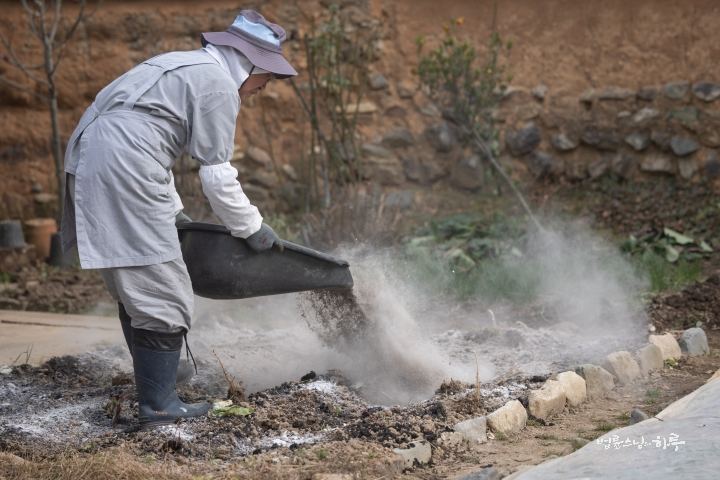 After cleaning up the area where the cabbages were trimmed, Sunim headed for the vegetable gardens. He sprinkled fertilizer, sesame dregs, and ash evenly on the ground and mixed them with the soil.