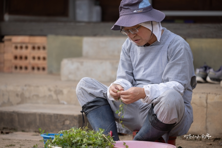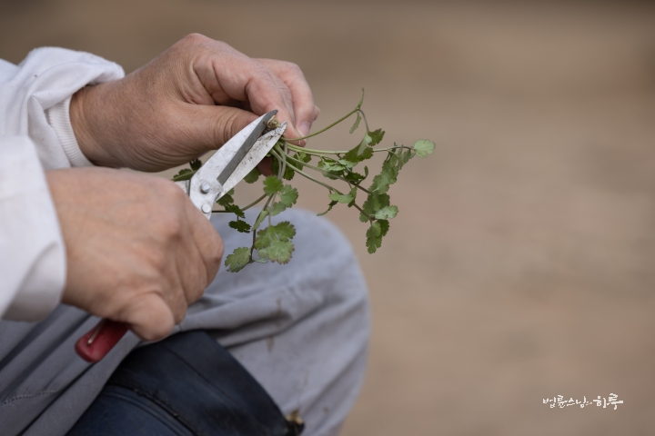 Sunim spotted coriander when he was about to mix the sprinkled fertilizer with the soil in the vegetable garden at the back. He harvested it first. There was enough to fill a wash bowl. After harvesting the coriander, Sunim broke up the soil and leveled the ground.