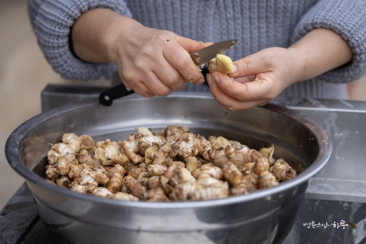 Sunim continued to trim the ingredients to be used for kimchi seasoning.