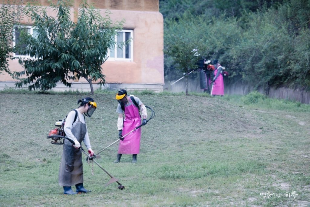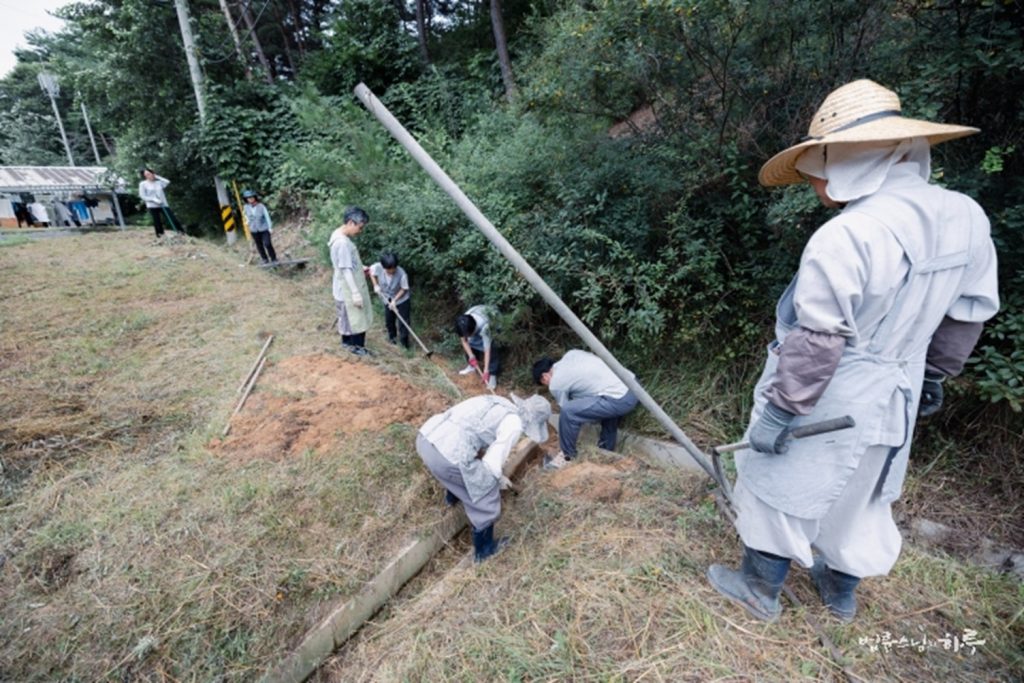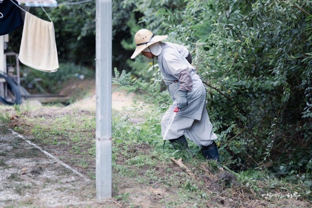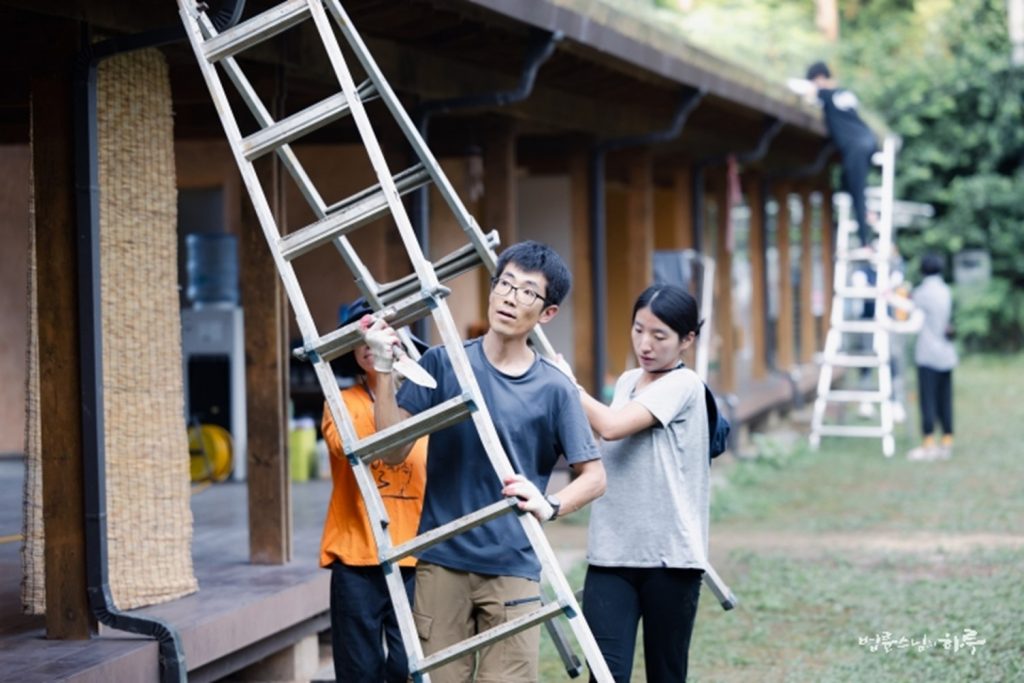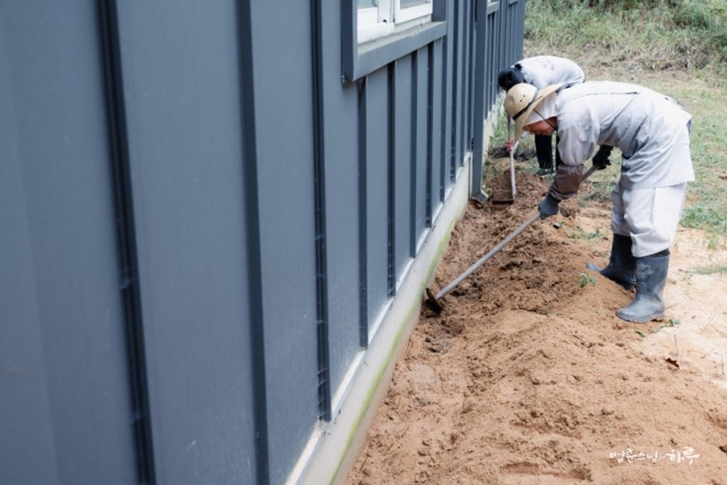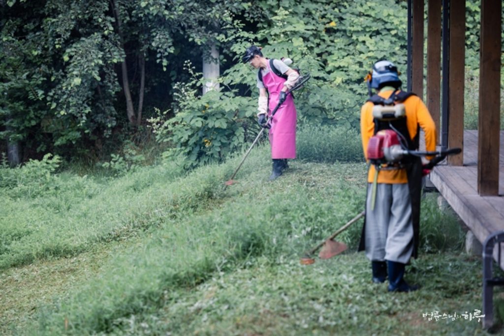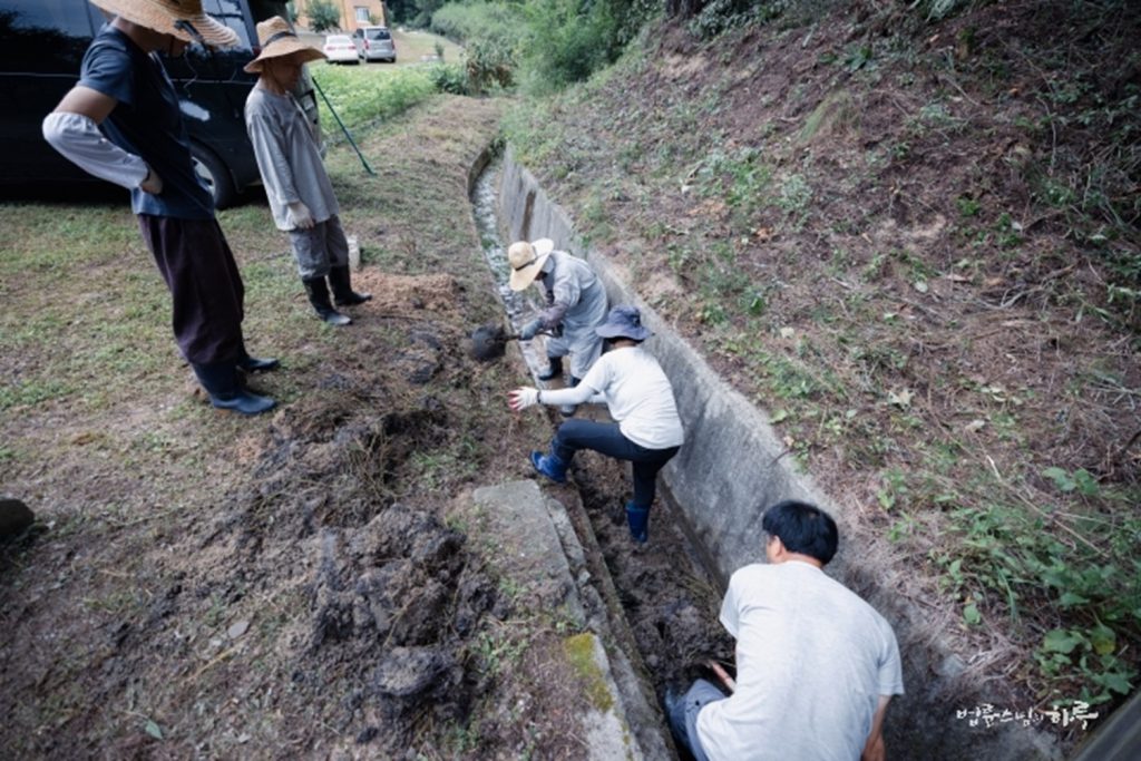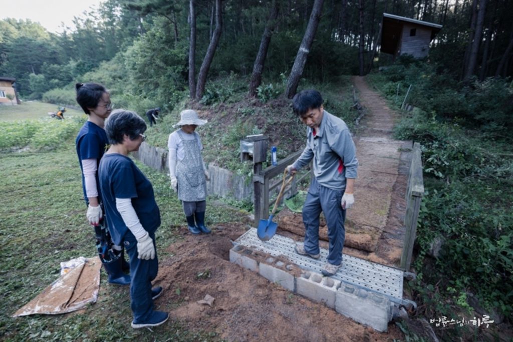 Due to the forecast for Typhoon Khanun to sweep across the Korean Peninsula during the retreat, Sunim and the sangha members worked on maintaining the retreat center to prevent potential damage. Heavy rain during the recent monsoon had caused soil to wash down from the mountain, prompting the digging of drainage channels around the buildings and the repair of the damaged bridge.