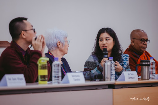 The panel then took a photo with Sunim before heading to the cafeteria for lunch.