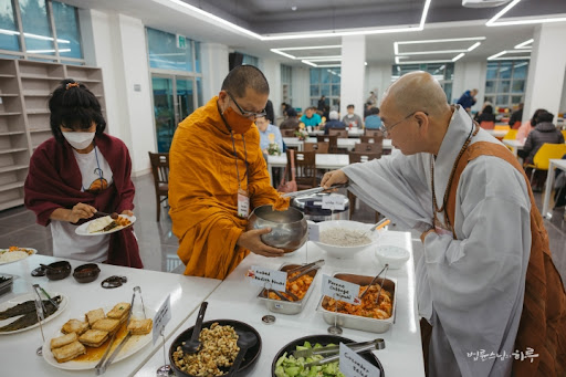 After the Yebul ceremony and morning practice that began at 5:00 am, breakfast was served at 6:00 am. Ven. Pomnyun Sunim has been offering food to bhikkhus (male monastics) from Thailand each morning since the conference began. Sunim also put rice and side dishes into their alms bowls today.