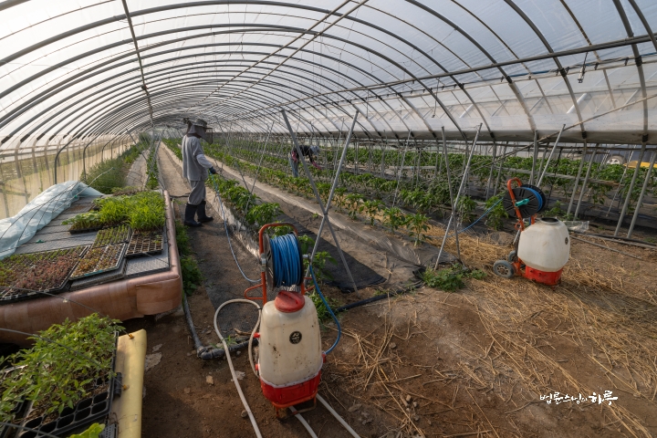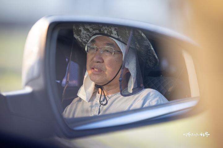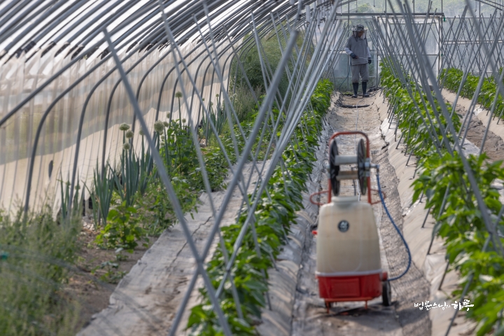 Sunim finished spraying a row and then moved on to the next. After moving back and forth without stopping, the work was completed by 8:30 am.