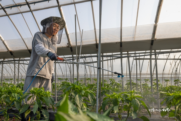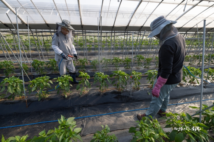 Other members of the agricultural team were busy, so four people, Sunim and three haengjas, started to spray the pesticide. As all of the pepper plants in two greenhouses needed to be sprayed, it took a long time.
