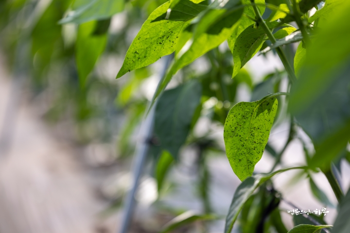 When we arrived at the greenhouse, the agricultural team haengjas (*Pabbajja program participants) had already started to work. It had only been a short while ago that the seedlings were transplanted, but aphids had already appeared on the pepper plants. As the agricultural team was busy planting rice seedlings throughout the last week, they didn’t have time to pay attention to the crops in the greenhouse. In the meantime, the aphids had spread.