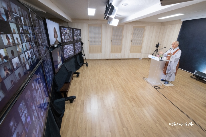 At 8 pm, the live-streamed Jungto Dharma School began. Sunim greeted the students as they joined the video conference.