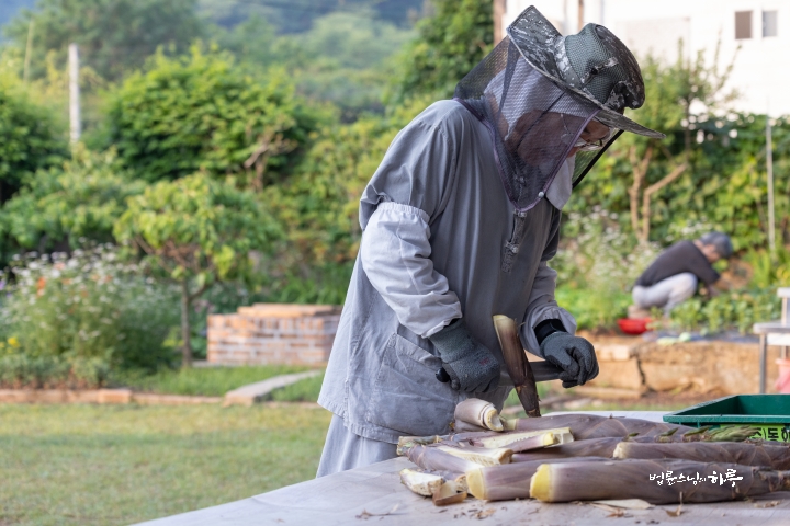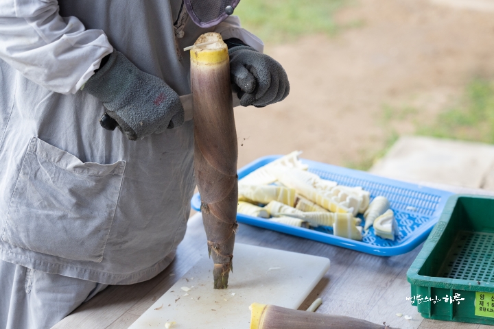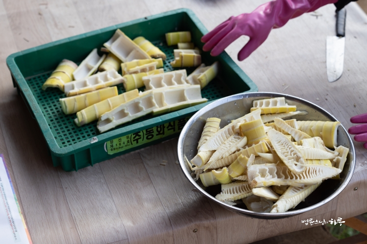 Sunim sorted the bamboo shoots into hard and soft parts and then boiled them in water.