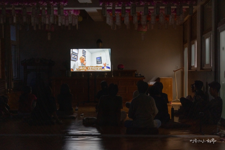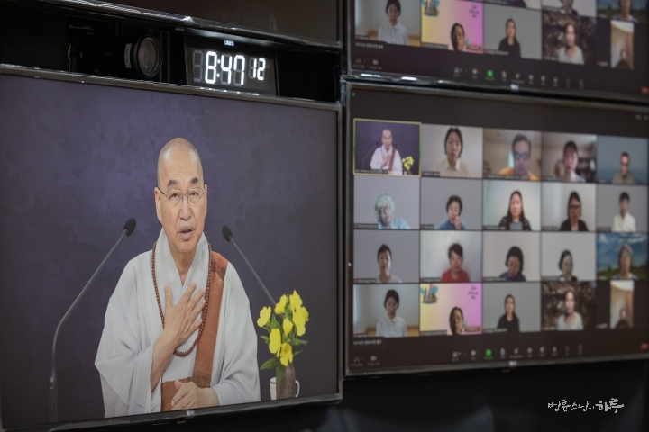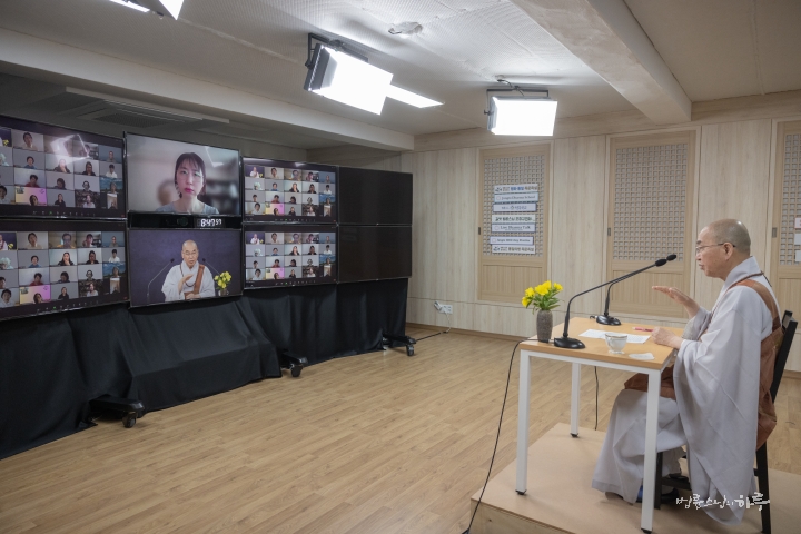 After his daily morning practice and meditation, Sunim began his day with an English Dharma Q&A session for a global audience at 8 a.m. The emcee warmly greeted about 200 viewers tuning in from around the world.