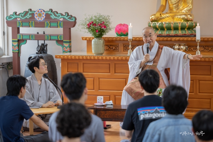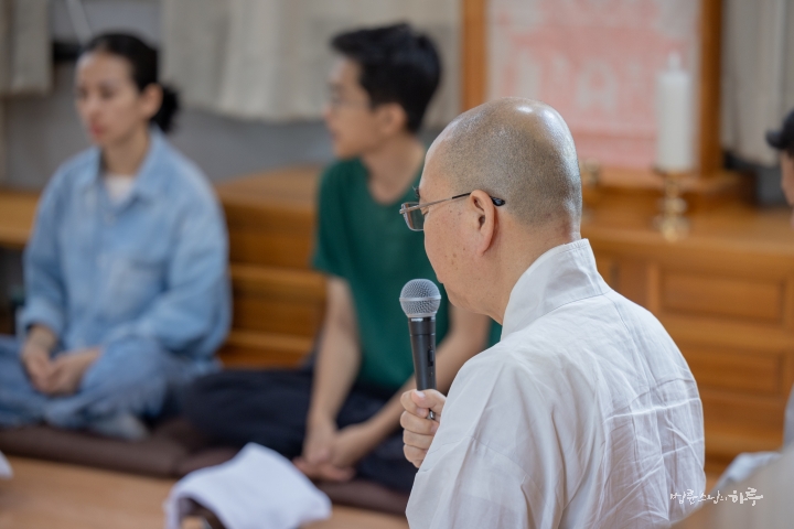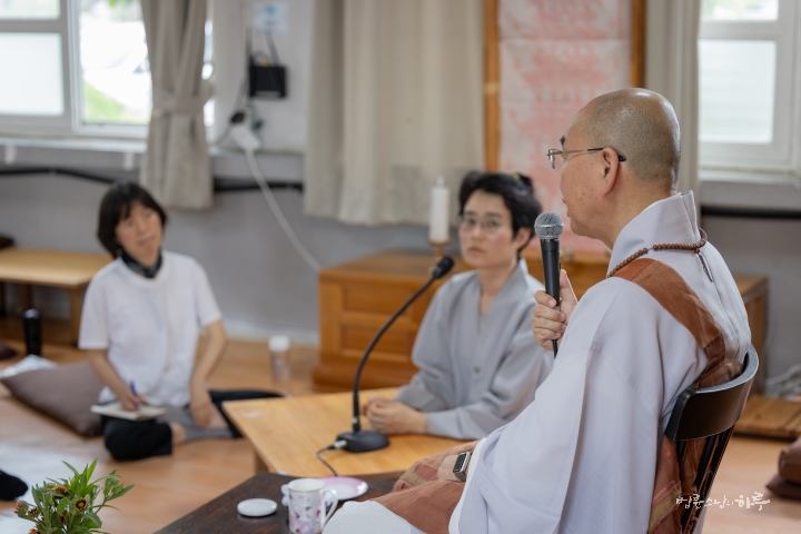 Before starting the conversation, Sunim briefly introduced the activities at Dubuk Jungto Retreat Center.