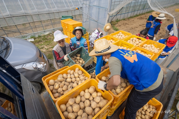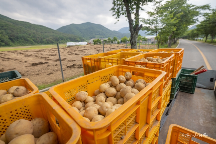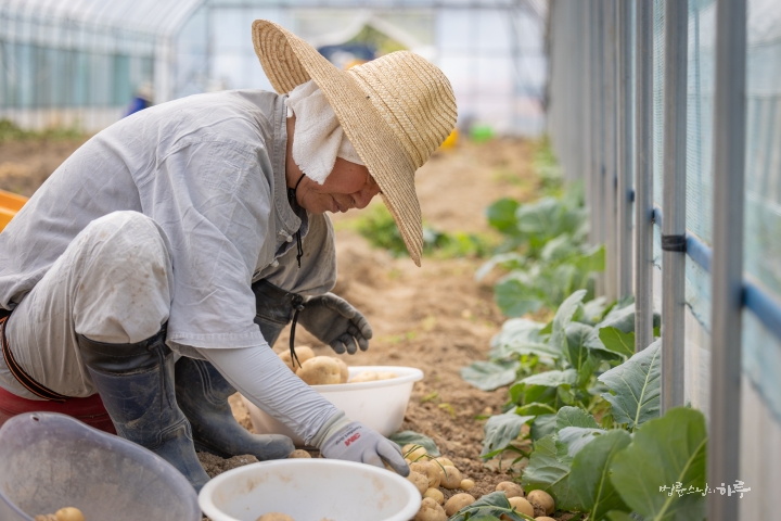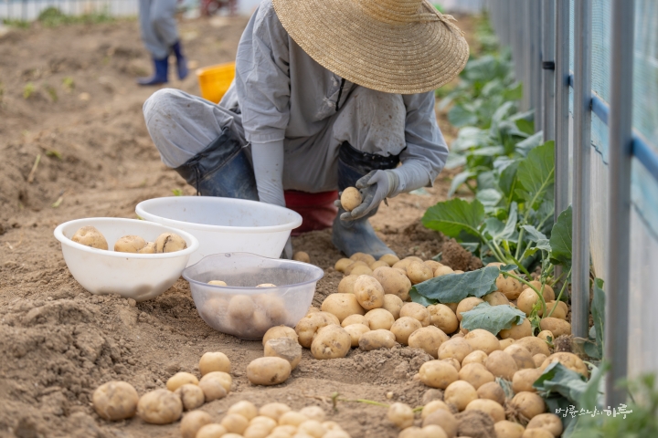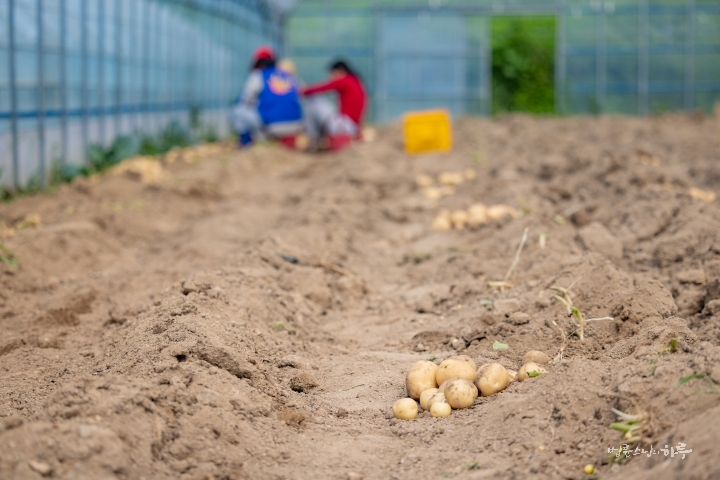 Along the edge, there were many weeds, so Sunim picked up potatoes one by one with his hands while pulling out the weeds. By scraping beneath the furrow with a hoe, causing it to collapse, the potatoes came tumbling out.