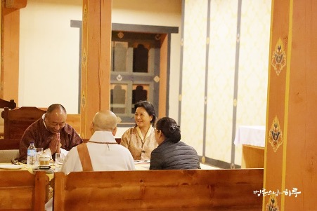 At 7 pm, Sunim had a conversation with Dasho Pema, a prominent candidate for the position of prime minister in January next year. Dasho Pema visited Sunim at his lodging. They had a conversation over dinner prepared by the bhikkhunis. Dasho Pema mentioned that he had previously worked as a government official and was preparing for the upcoming election. He also said that he had heard about Sunim from Dr. Tashi and was curious to know Sunim’s schedule in Bhutan and his impressions of the country during his visit.