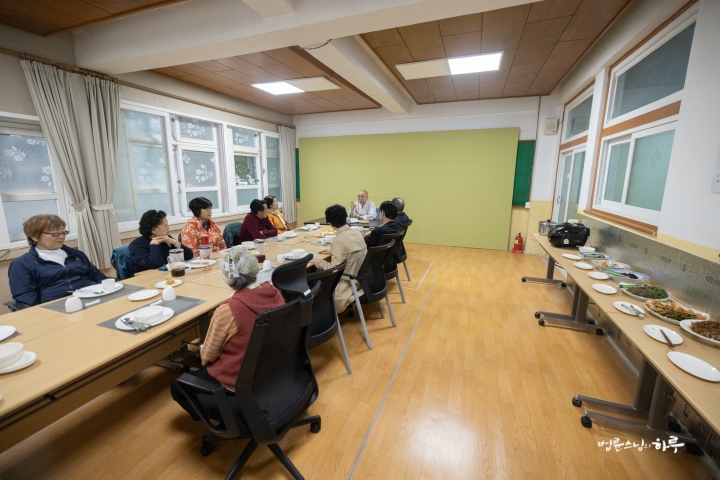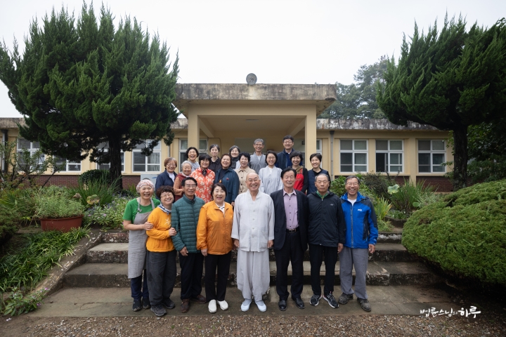The Korean-Chinese elders had been staying at the Dubuk Retreat Center for the past two days, engaging in numerous conversations with Sunim. After finishing breakfast, they continued their discussions and took commemorative photos together.