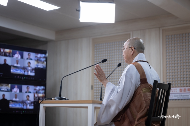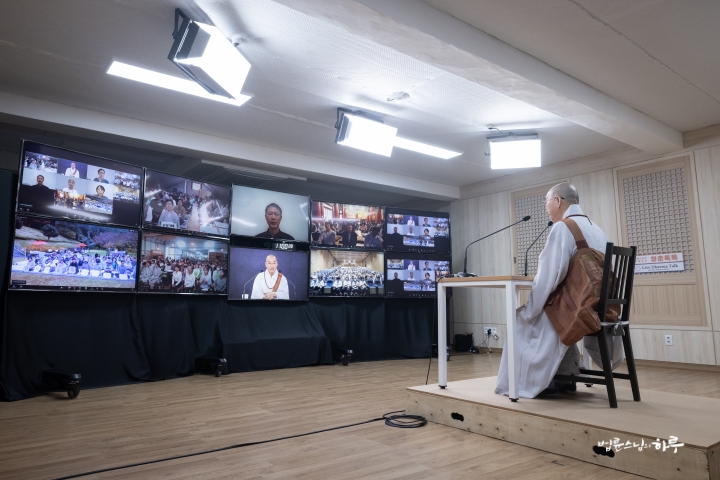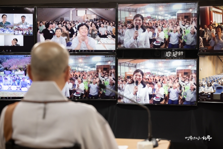 Following this, participants from the main temples nationwide asked questions, and Sunim answered from the broadcasting room at the Dubuk Retreat Center. Various questions about environmental practices continued for an hour.