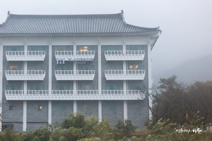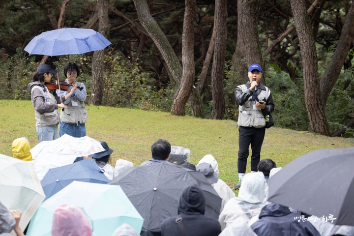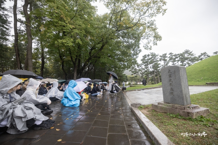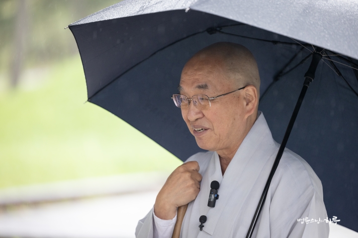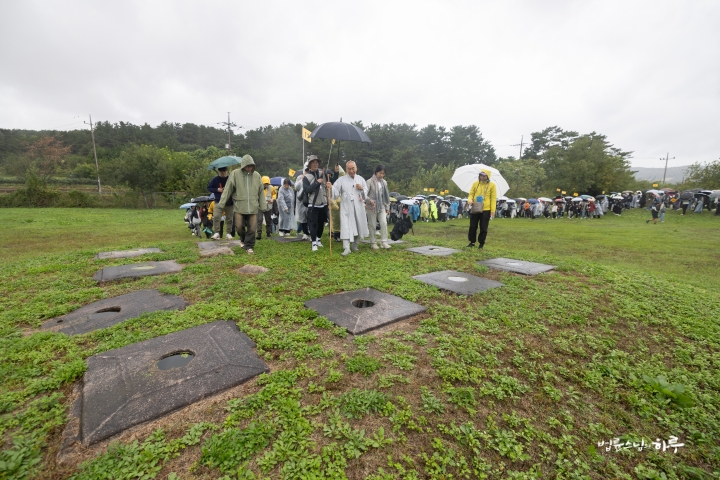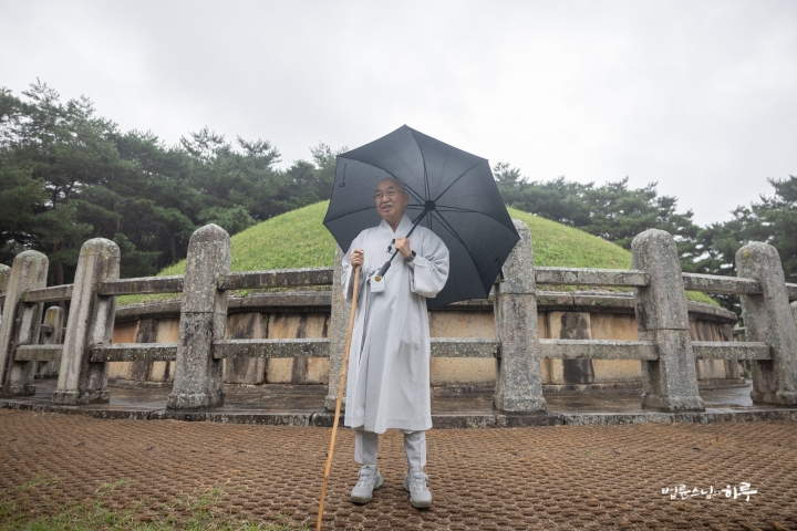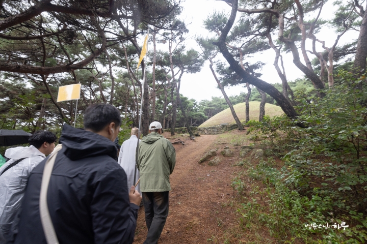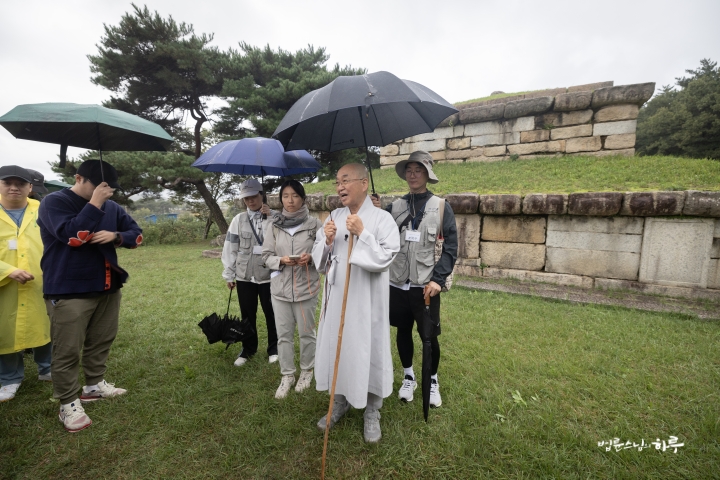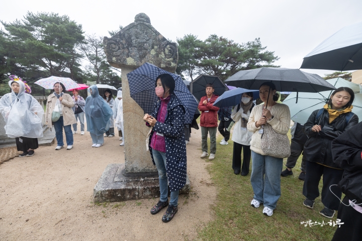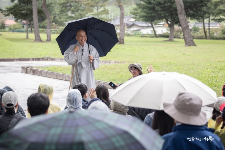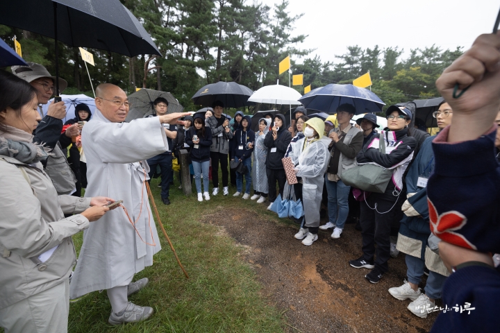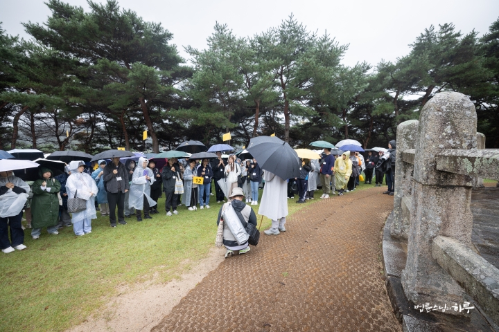 The sun was already setting. The group descended the mountain path again and headed towards Neungji Pagoda, built at King Munmu’s cremation site. As the rain got heavier, Sunim wrapped up his explanation briefly.