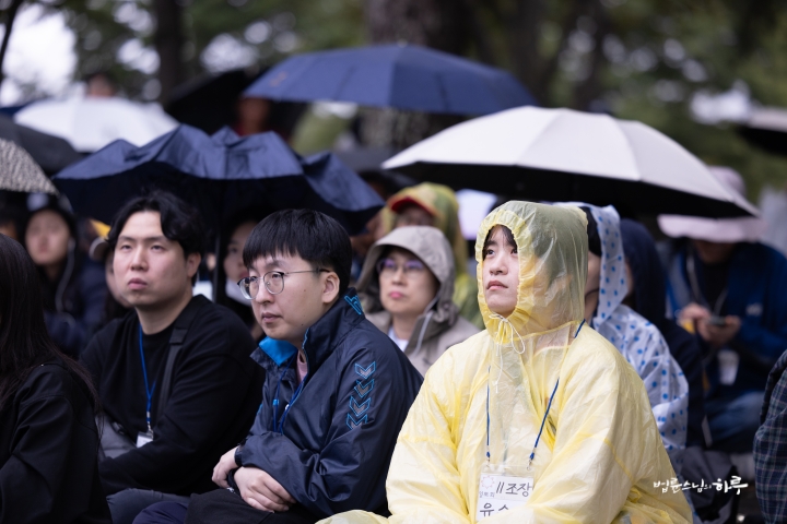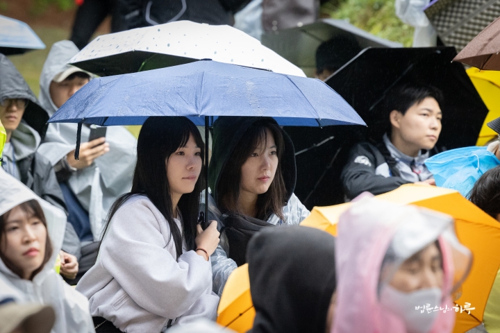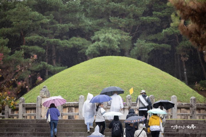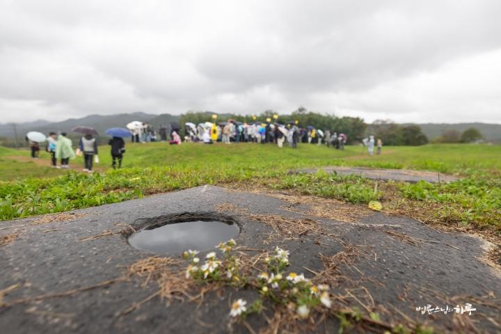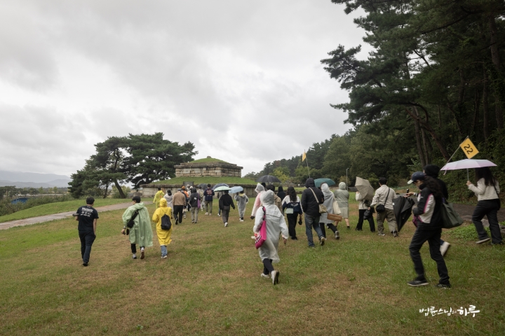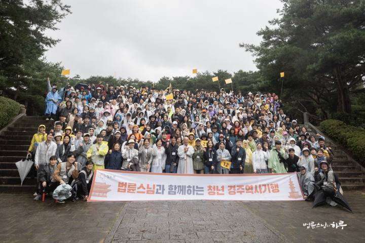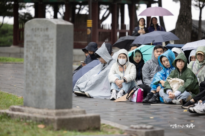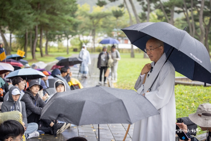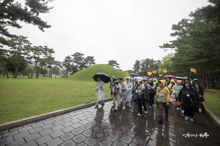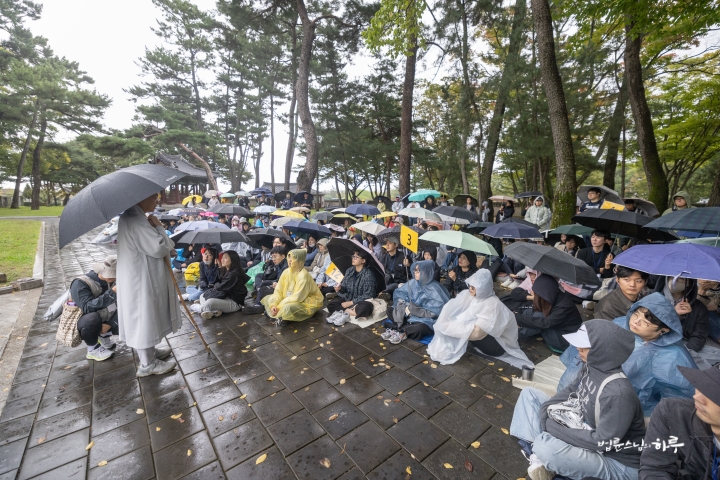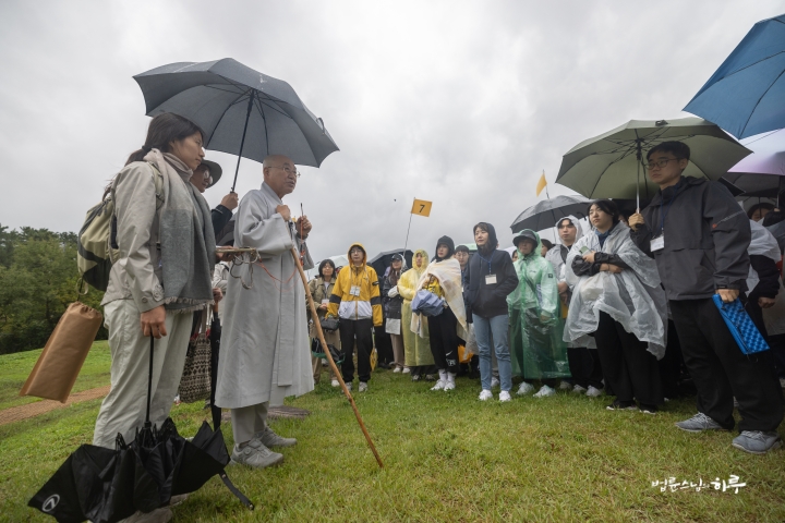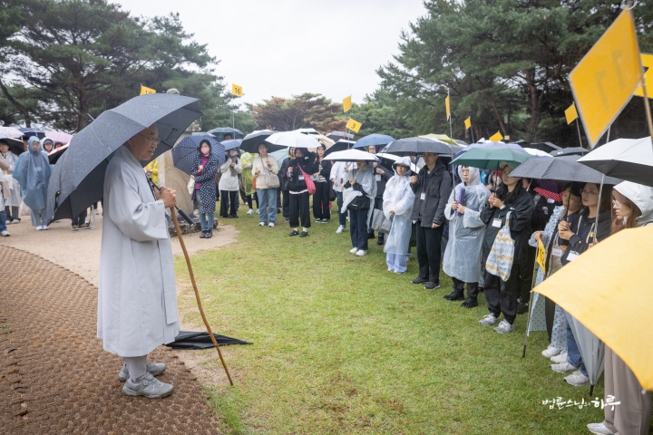 After warmly welcoming each other during the participant introduction time, Sunim explained the purpose of this history tour and discussed how Silla, a small country, was able to emerge as the mainstream of national history. Despite the pouring rain and strong wind, the young people remained fully focused on Sunim’s words.