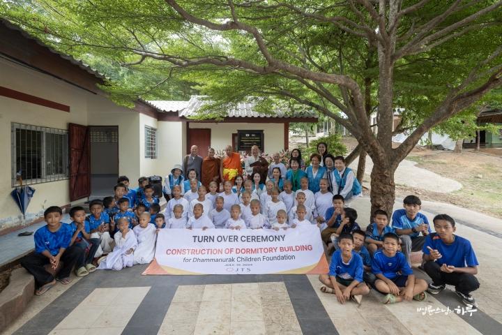 The revered Korean Dharma master and Buddhist activist Venerable Pomnyun Sunim (법륜스님) and volunteers from the Buddhist humanitarian relief organization JTS Korea, accompanied by a delegation from the International Network of Engaged Buddhists (INEB), attended a formal ceremony on 18 July to inaugurate two new buildings for a Buddhist orphanage in the western Thai province of Kanchanaburi.
