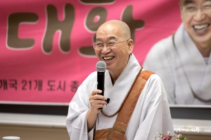 The Korean Seon (Zen) master Venerable Pomnyun Sunim (법륜스님) wears many hats: Buddhist monk, teacher, author, environmentalist, and social activist, to name a few.* As a widely respected Dharma teacher and a tireless socially engaged activist in his native South Korea, Ven. Pomnyun Sunim has founded numerous Dharma-based organizations, initiatives, and projects that are active across the world. Among them, Jungto Society, a volunteer-based community founded on the Buddhist teachings and expressing equality, simple living, and sustainability, is dedicated to addressing modern social issues that lead to suffering, including environmental degradation, poverty, and conflict.
