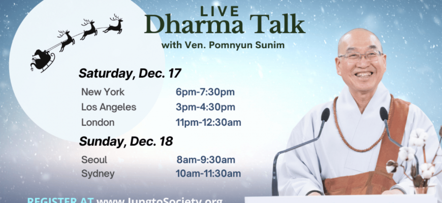 Jungto Society, the international Buddhist community founded by the revered Korean Seon (Zen) master and social activist Venerable Pomnyun Sunim (법륜스님), has announced that the renowned Dharma teacher will conduct a global live-streamed Dharma talk on 18 December.