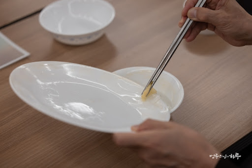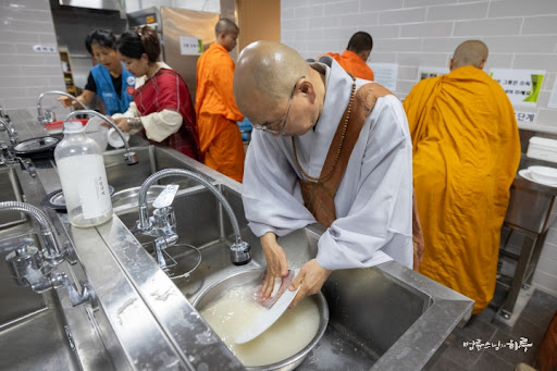 “After finishing your meal, use a slice of kimchi to clean your plate and bowl. As you can see, I’ve already cleaned my plate and bowl. Jungto Society has been actively engaged in the zero-waste movement as part of its environmental efforts. Do you understand?”