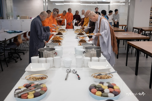 At 11 am, they ate lunch prepared by volunteers from the Seoul and Jeju Division and the International Division in the basement cafeteria. Today, the bhikkhunis from Bhutan led the meal prayer.