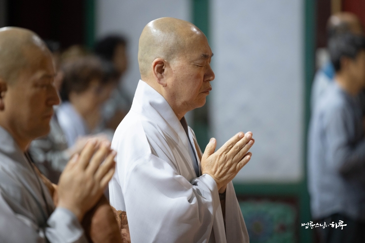 Ven. Pomnyun Sunim began his day with the Yebul ceremony in the Main Hall of Jungnimjeongsa at 4 a.m. A prayer—initiated in 1999, following Master Yongseong’s teachings on the prosperity of the Daehan Jeongguk (Righteous Nation of the Great Han) for 800 years—has continued for 25 years. Today it will culminate with a gathering of 10,000 people. Sunim performed each prostration with utmost care.