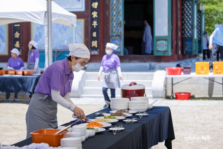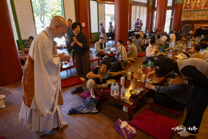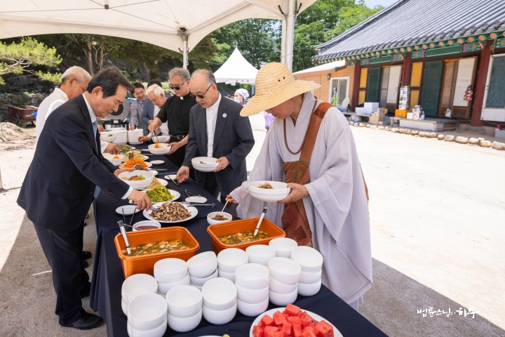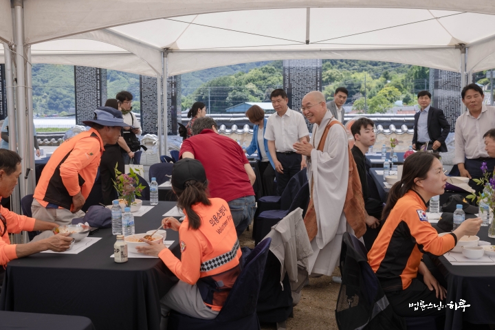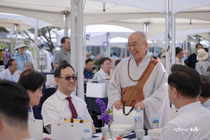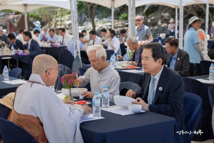 The guests moved to the front courtyard of Jungnimjeongsa and ate lunch there. Sunim had a meal of bibimbap together with former Speaker of the National Assembly Chung Sekyun.