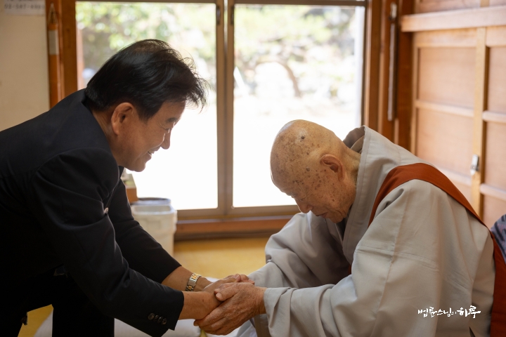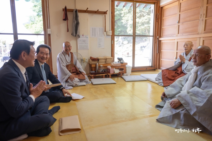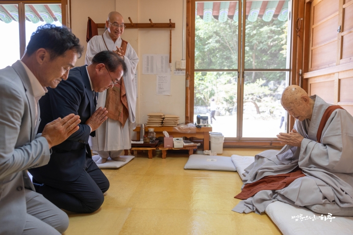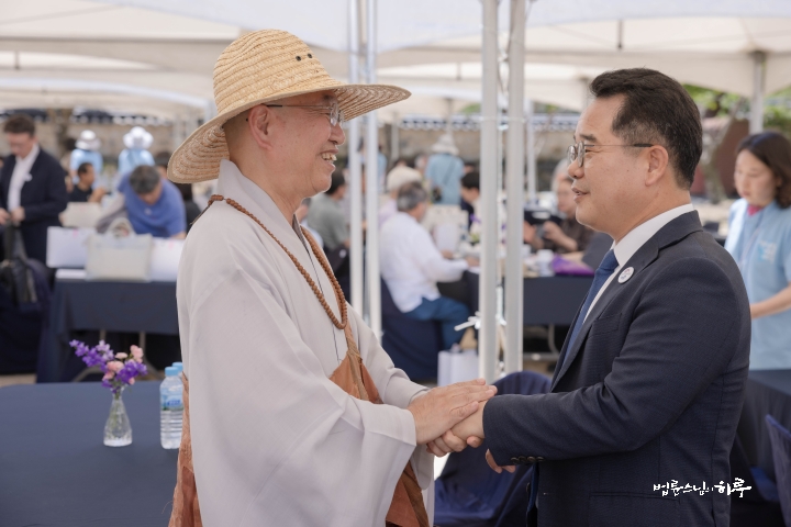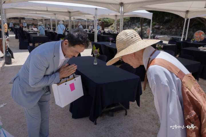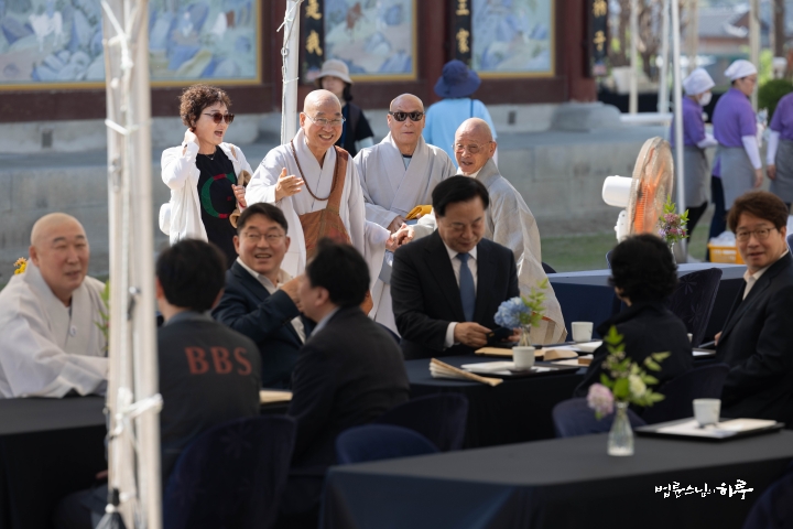 Sunim welcomed esteemed guests in front of the temple’s living quarters, warmly greeting senior social leaders, religious leaders, politicians, civic activists, and media and cultural artists.