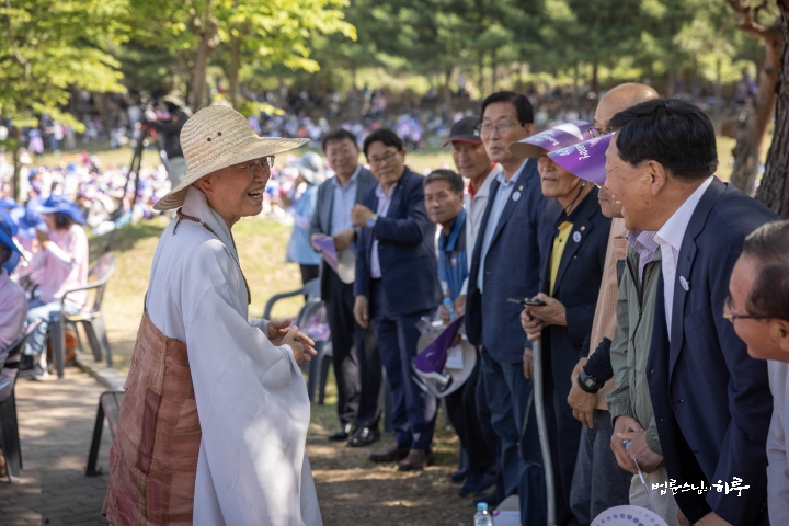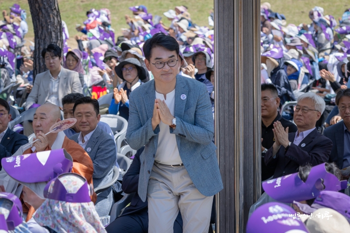 “The Donghak Cheondogyo, to which I belong, shares a deep relationship with Master Yongseong in many ways. When Master Yongseong represented the Buddhist community during the March 1st Movement in 1919, Cheondogyo leader Son Byeong-hui, who inherited the spiritual lineage of Su-un, was at the center of the movement. In the late 19th century, during a time of national crisis, Su-un Choe Je-u and Hyewol Sunim joined hands, and later, in the independence movement, Son Byeong-hui and Master Yongseong united. Master Yongseong and Cheondogyo continued this relationship in their joint efforts to end the era of Previous Heaven and begin the new era of Later Heaven. Standing here with Ven. Domun and Ven. Pomnyun, continuing this relationship, fills me with deep emotion. Nowadays, Master Yongseong is more widely known, and more Koreans are aware of his achievements. This is the result of the tireless efforts of his followers. I send my heartfelt support and appreciation for your dedication and hard work.”