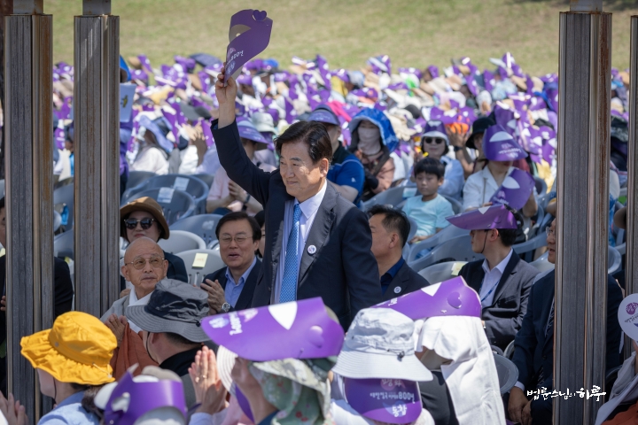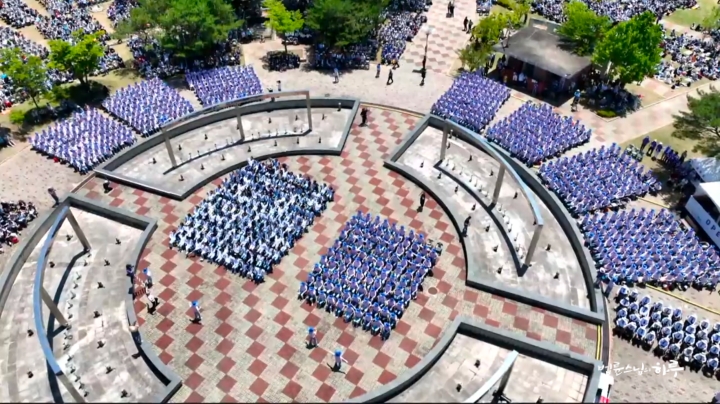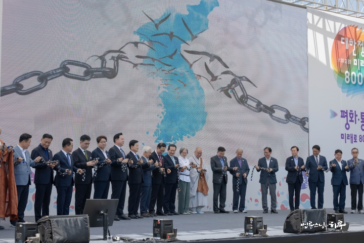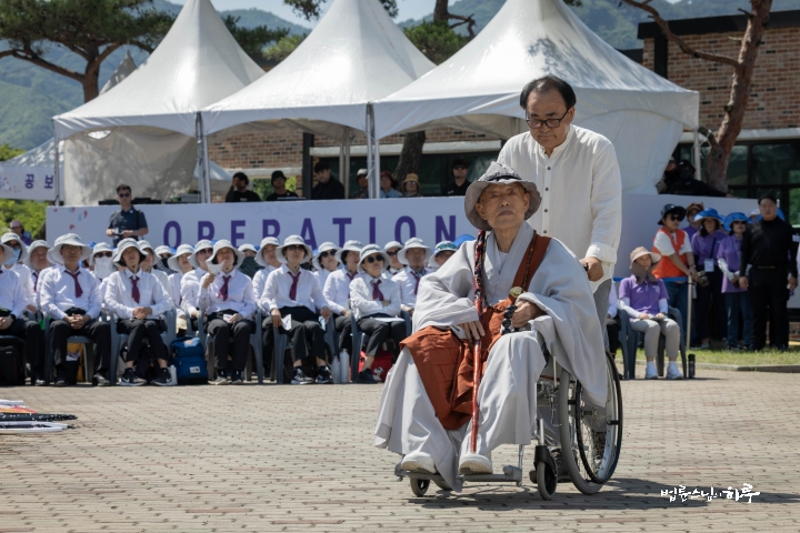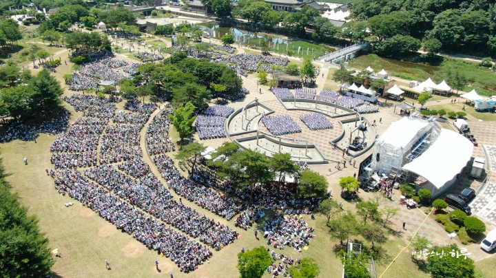 On the screen, scenes from the “Pre-Peace Actions” conducted by the members of Jungto Society from late April to late May, both domestically and internationally, were showcased. As the flag-bearers reached the endpoint and turned toward the stage, a drone ascended into the sky.