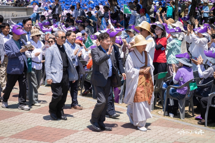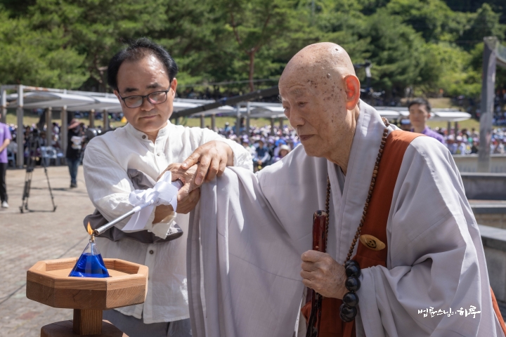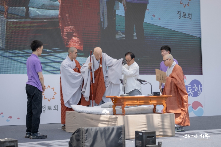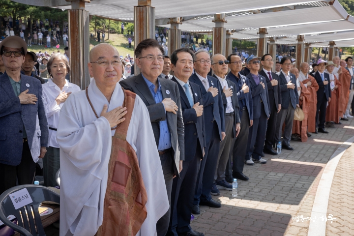 Master Domun concluded the Dharma talk within 10 minutes. Amid enthusiastic applause, he stepped down from the stage. The participants then watched a video that encapsulated the future vision of the June 13 Dharma assembly and the long-held wishes of the Korean people.
