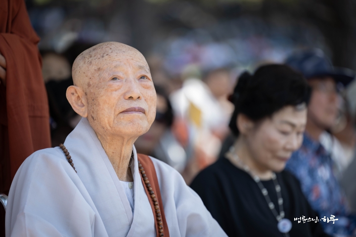 Sunim introduced the disciples of Master Bulsim Domun, including Ven. Hwangsan Heychong, former head of the Jogye Order of Korean Buddhism, Ven. Dobeop, chief monk of Silsangsa Temple, Ven. Jihong, chief monk of Geumgangjeongsa Temple, and other eminent monks. He also introduced notable religious leaders such as Park Kyungjo of the Anglican Church Diocese, Reverend Park Jonghwa, and Father Kim Hongjin, along with distinguished academics and cultural figures, such as Choi Sangyong, Honorary Professor at Korea University, Yoo Keun, Endowed Chair Professor at Far East University, writer Kim Hongshin, and screenwriter Lee Geumrim. Each introduction was met with enthusiastic applause from the audience.