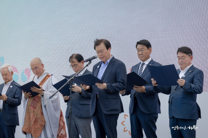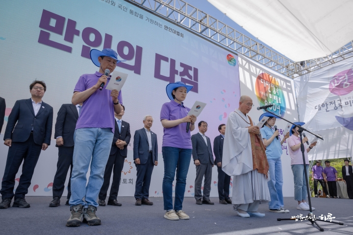 Next, “The Resolution of 10,000 People for Peace and Unity” was recited. The President of Jungto Society, the Head of Jungto International, the Head of the Special Youth Division, and the Head of the Happiness Movement Headquarters came forward and read aloud each line with a resounding voice.