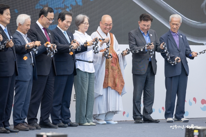 Thirty-three distinguished guests took the stage. Thirty-three people were designated to perform the ceremony to symbolize the energy of 33 heavens in Buddhism, just as 33 people signed the Declaration of Independence 105 years ago under the proposal of Master Yongseong. While 33 representatives holding the chain symbolizing ordeal of this era in their hands, the emcee exclaimed,