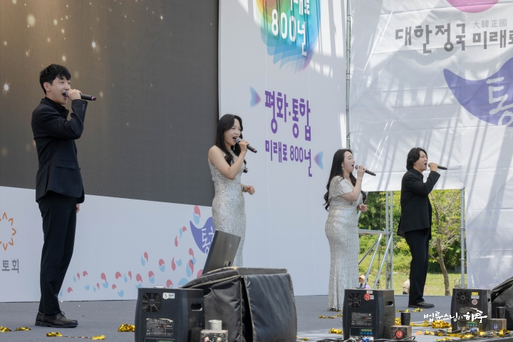 After the conclusion of the first half of the ceremony, emcee Kim Byeongjo left the stage, and the second part began with a performance by the mixed quartet Fiancé, who beautifully sang the songs “Teo(This Land)” and “My Country, My People.”