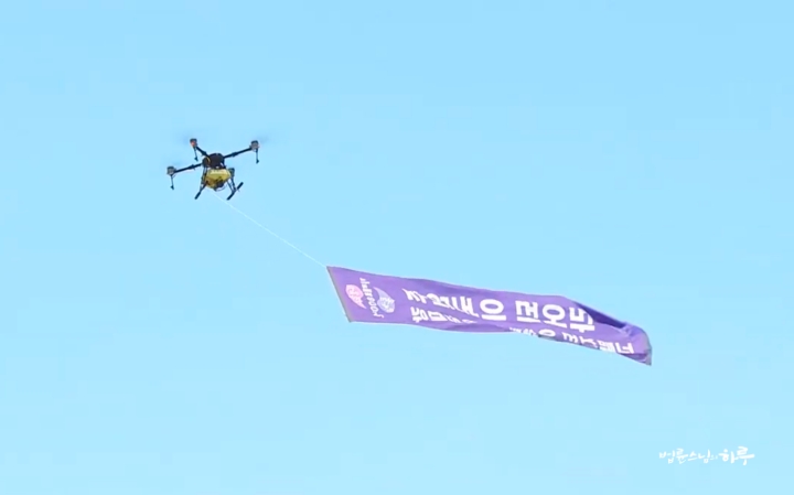 The drone bore aloft a large banner exhorting two teachings of Master Yongseong: “Don’t become a satellite state of a powerful nation, but become an autonomous nation,” and “Become the ruler of the Righteous Nation of the Great Han and lead world peace.” The heartfelt wishes of the people were carried high into the sky.