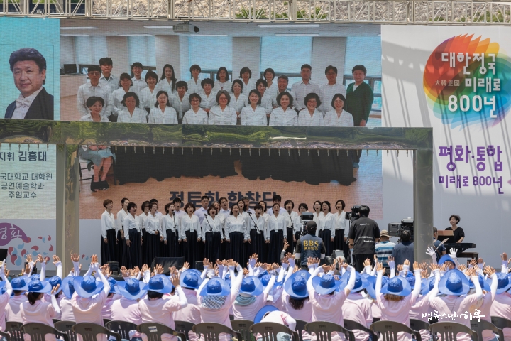 The proceedings concluded, and the guests quietly exited, while the rest of the participants continued with the chorus of peace. For this Grand Dharma Assembly, the Jungto Society Choir assembled, with Professor Kim Hong-tae from Kyungdong Presbyterian Church serving as conductor. Professor Kim generously volunteered his talent to conduct the choir for this occasion.