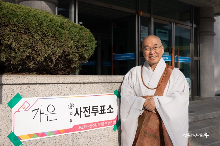 After morning practice and meditation, Sunim left Dubuk Jungto Retreat Center for Mungyeong at 6 am. On the way, he made a brief stop at Gaeun Elementary School, which was being used as a polling station for early voting, to cast his ballot for the 22nd parliamentary election.