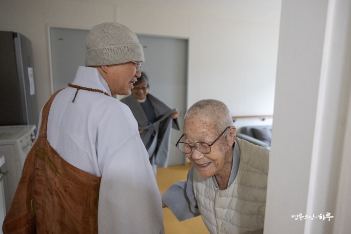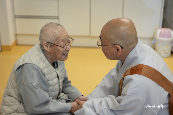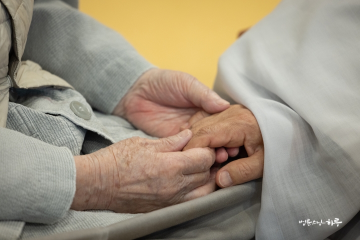 Pomnyun Sunim warmly held Jahaeng Sunim’s hands and handed her some spending money.