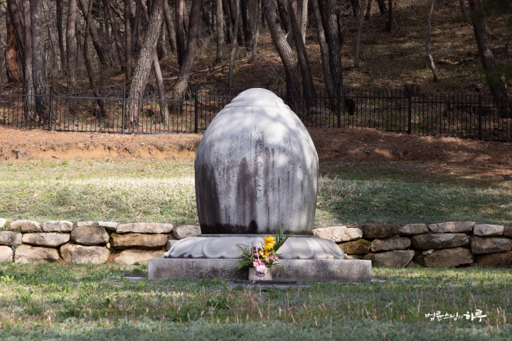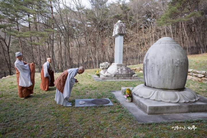 Sunim departed from Mungyeong Jungto Retreat Center and reached Bongamsa Temple around 9:30 am. Sunim decided to pay his respects at Ven. Seoam Sunim’s stupa first. Before entering the temple grounds, Sunim followed the winding road on the right until reaching the serene area where the stupa and the memorial stone stand.