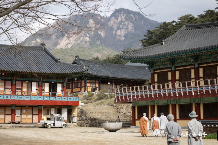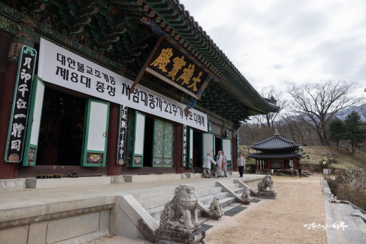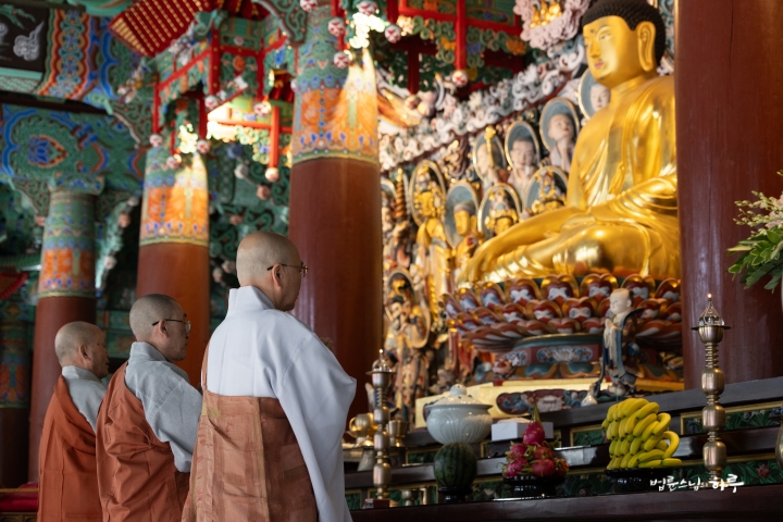 After paying respects at the stupa, Sunim had tea with Ven. Jinbeom Sunim, the chief monk of Bongamsa. They discussed recent events at the temple before heading to the Daeungjeon (Main hall) at around 10:30am.
