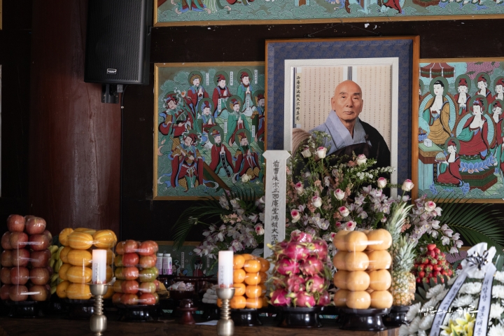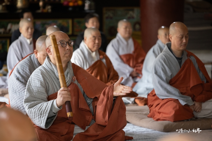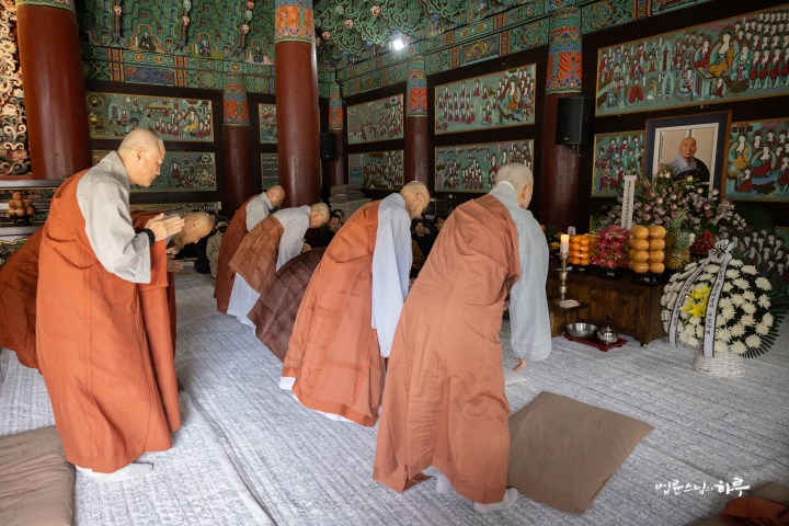 After performing Cheondojae, a ritual to bring peace and eternal rest to the deceased, the memorial Dharma meeting concluded with three claps of the bamboo clapper.